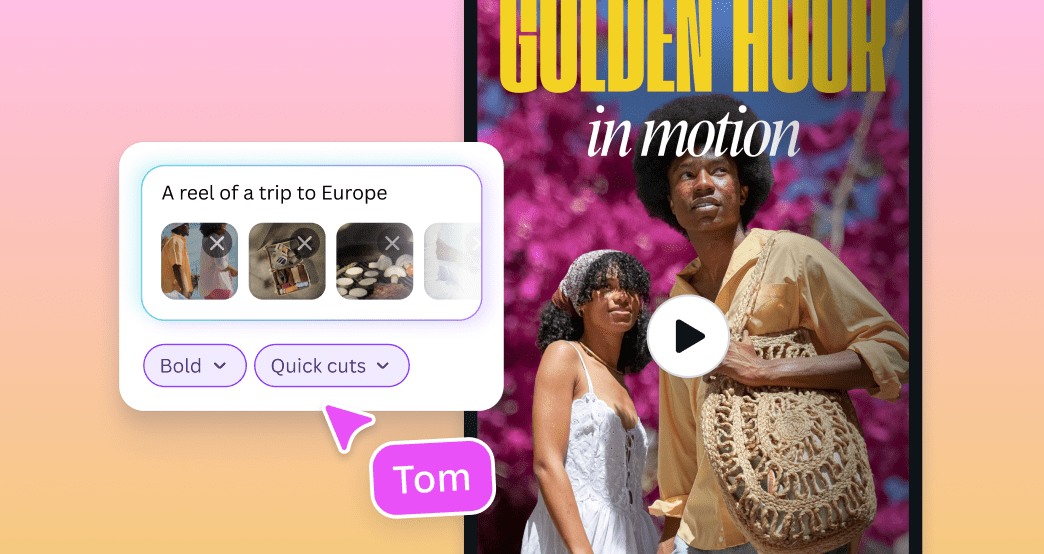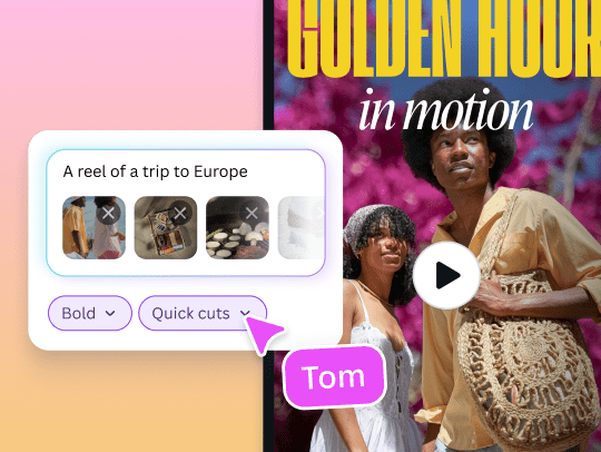 Create stunning videos on-the-go with the Canva mobile app. Simply drop in your clips and add a quick prompt - AI will instantly produce trendy video options for you.